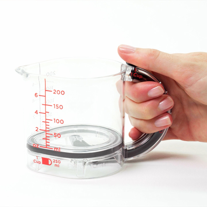 Appuyez simplement avec le pouce sur le curseur situé dans l’anse : le fond du verre doseur se soulève, la lèvre en silicone racle l’intérieur du verre et le contenu est entièrement poussé vers le haut. Lorsque le fond affleure le bord supérieur, il suffit de racler les derniers résidus à l’aide d’un couteau ou d’une spatule. Bien entendu, le verre doseur convient également à tous types d’ingrédients liquides et secs.