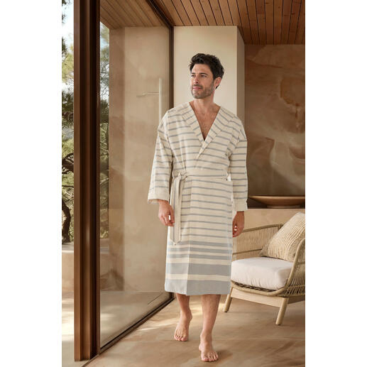 Ce peignoir est parfait pour tous ceux qui trouvent les peignoirs classiques trop épais, trop chauds ou trop conventionnels. Il est confectionné dans le même jacquard de coton que les serviettes fines utilisées dans les hammams orientaux, les « pestemals ».